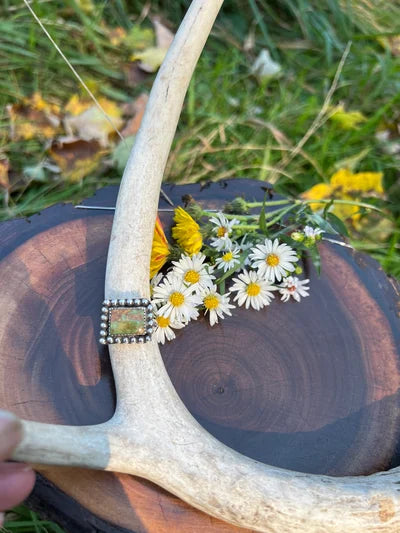 Green turquoise ring designed to fit sizes 6-7.5 with a band that has some give to it so it would fit easily over bigger knuckles and still remain snug enough to be comfortable once on.