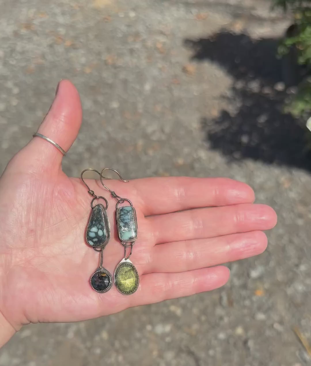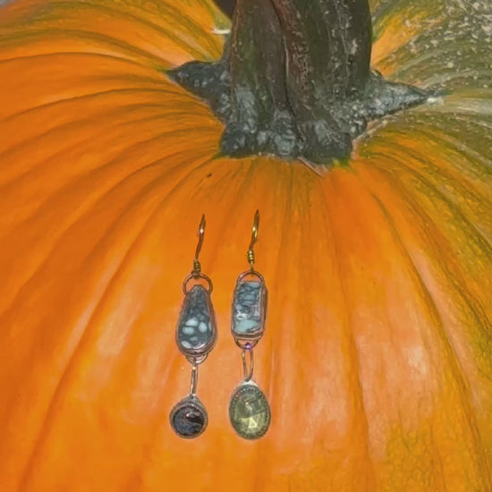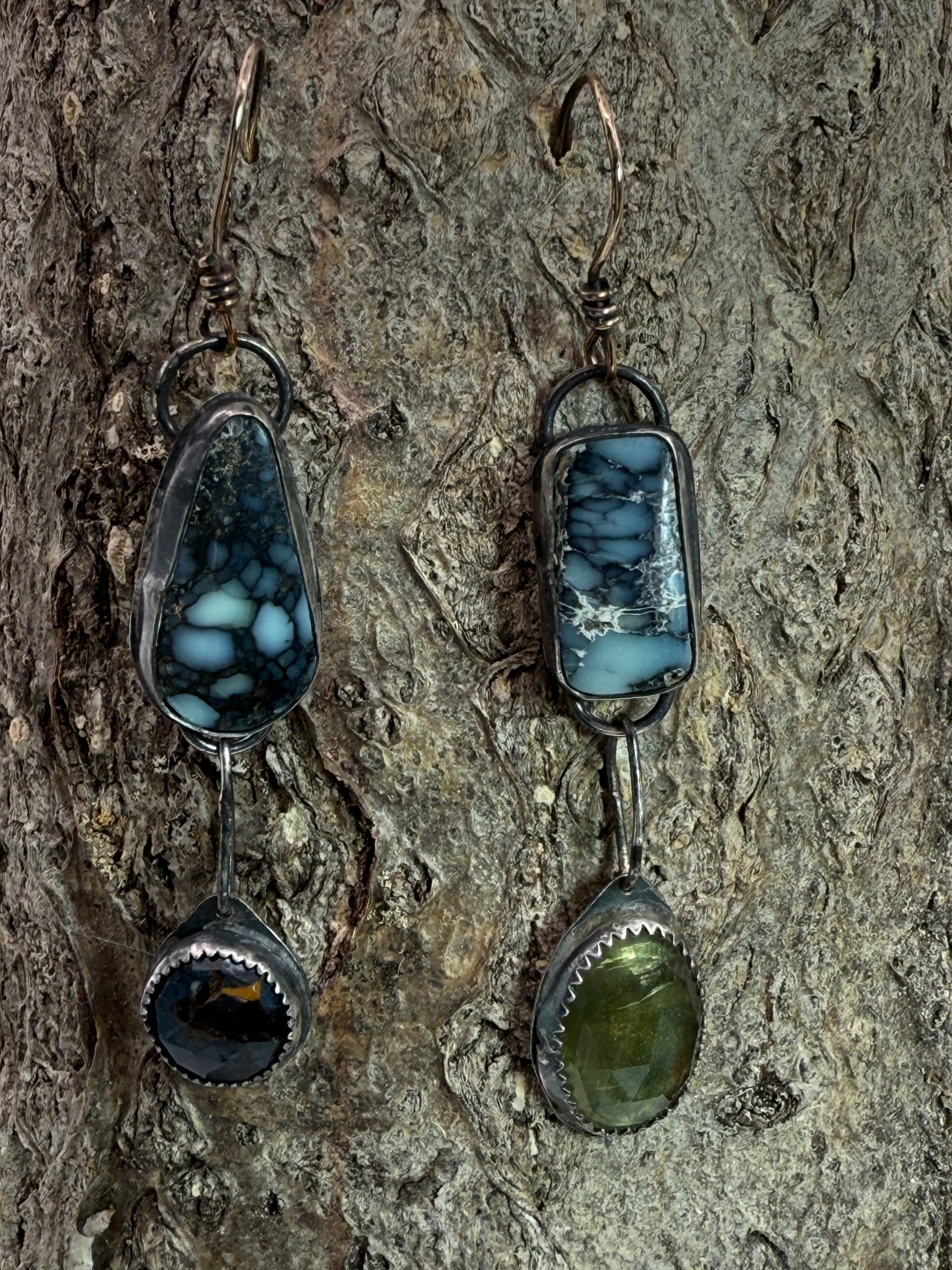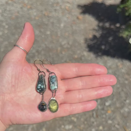 Made of sterling silver with an antique patina. Stones are variscite, pietersite and lemon quartz