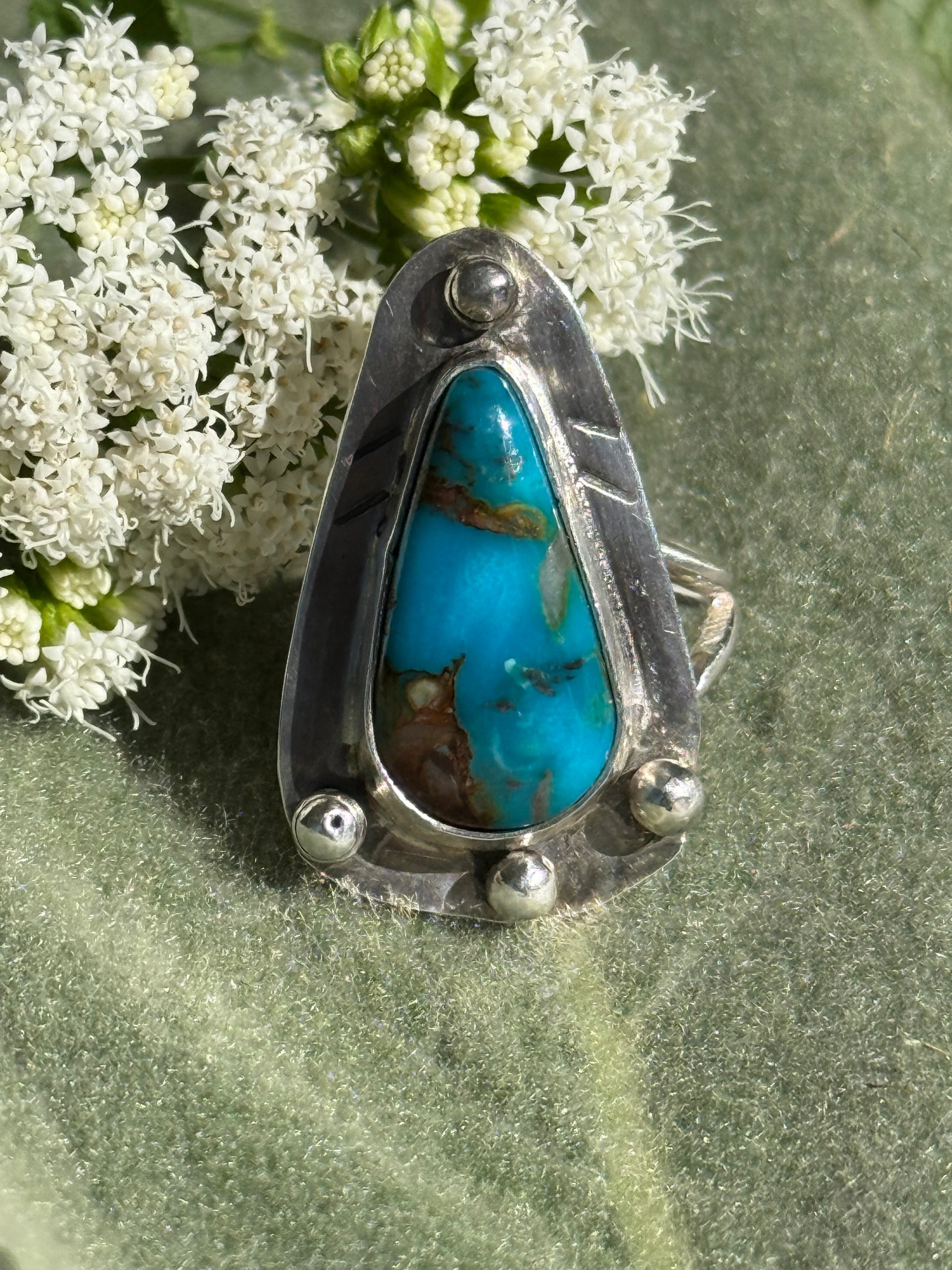 Made of sterling silver, fine silver, and Sleeping Beauty Turquoise stone.