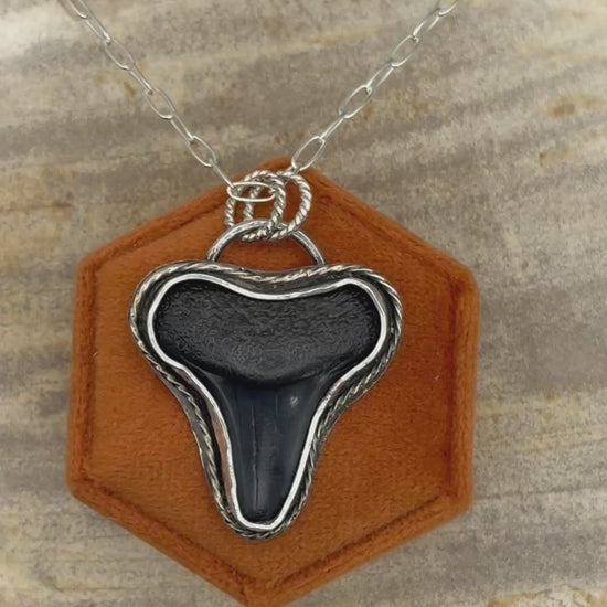 Made from sterling silver, fine silver, and a shark tooth fossil. Necklace is sterling silver.